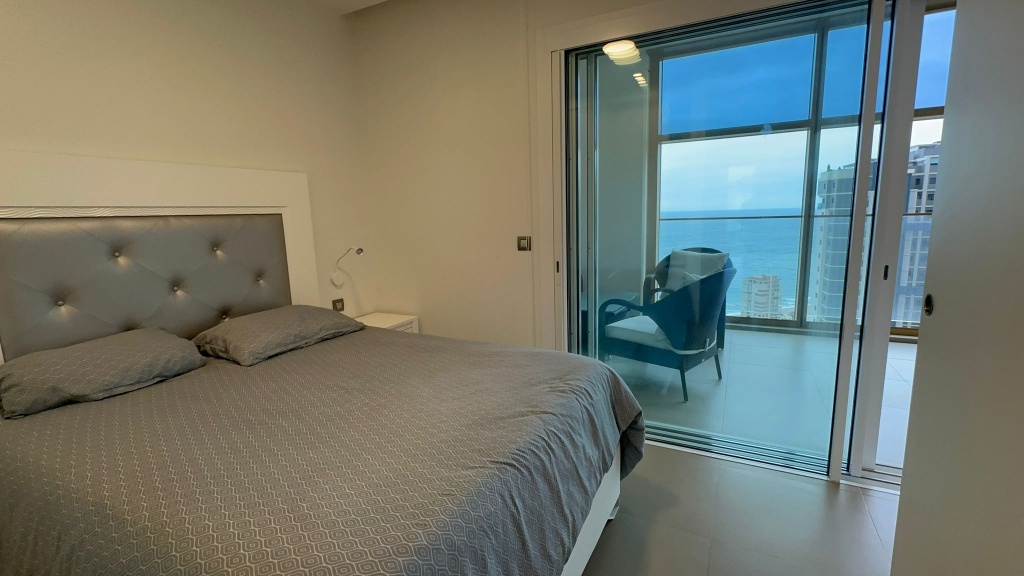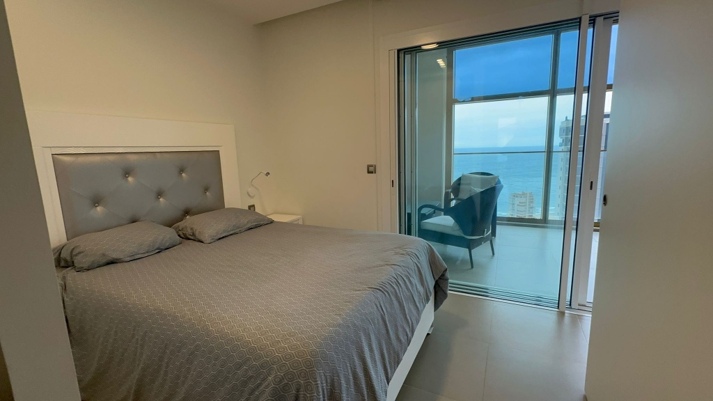 Cuenta con 2 amplios dormitorios con armarios empotrados. El principal, con baño en suite, tiene acceso directo a la terraza amplia y privada, desde donde se pueden contemplar unas vistas espectaculares al mar y a toda la ciudad. La orientación y la altura hacen que la luz natural inunde cada rincón.