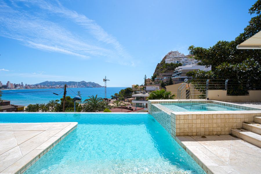 Lujosa villa situada en uno de los rincones más exclusivos por sus vistas y ambiente. Sus características la hacen única en su zona. Construida en una parcela de 1.080 m2 y la construcción de 900 m2 distribuidos en tres plantas con ascensor. En la planta baja se encuentra un amplio salón y un gimnasio totalmente equipado con vistas al mar, mas tres dormitorios con baños completos en suite y con acceso directo a las terrazas y jardines. También en esta planta existe un trastero, cuarto de lavado, cuarto de maquinaria. En el sótano existe un garaje con capacidad para 4 vehículos grandes. En la primera planta hay un amplio distribuidor y dos salas de lectura/cine. Cocina de diseño con dos salones-comedores y un aseo de servicio. Todas las estancias se comunican con una amplias terrazas y la piscina infinity, barbacoa con un aseo para invitados y jacuzzi. En la planta superior se distribuye en tres habitaciones con baño suite. Una de estas habitaciones está abuhardillada y la habitación principal tiene bañera de hidromasaje a nivel del suelo, ducha hamman, vestidor y acceso a las terrazas con excelentes vistas al mar Mediterráneo. Los materiales y acabados son de alta calidad. También posee aire acondicionado en toda la vivienda y alarma centralizada, ascensor de última generación, domótica y suelo radiante. Suelo de la vivienda combinados en madera y mármol travertino. Sin duda una oportunidad única para disfrutar de un emplazamiento y una villa única.